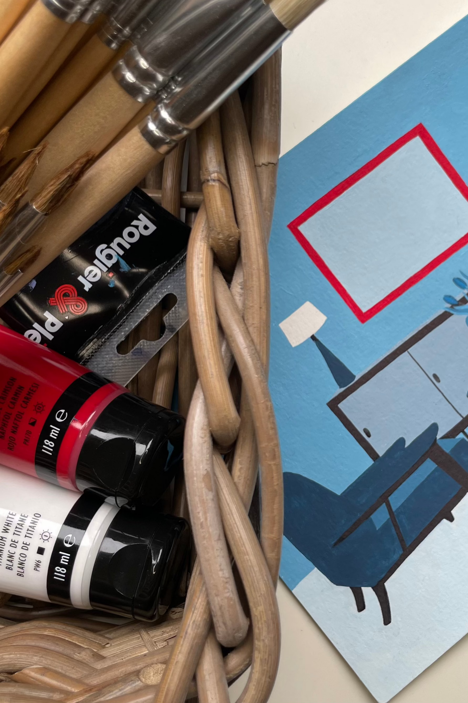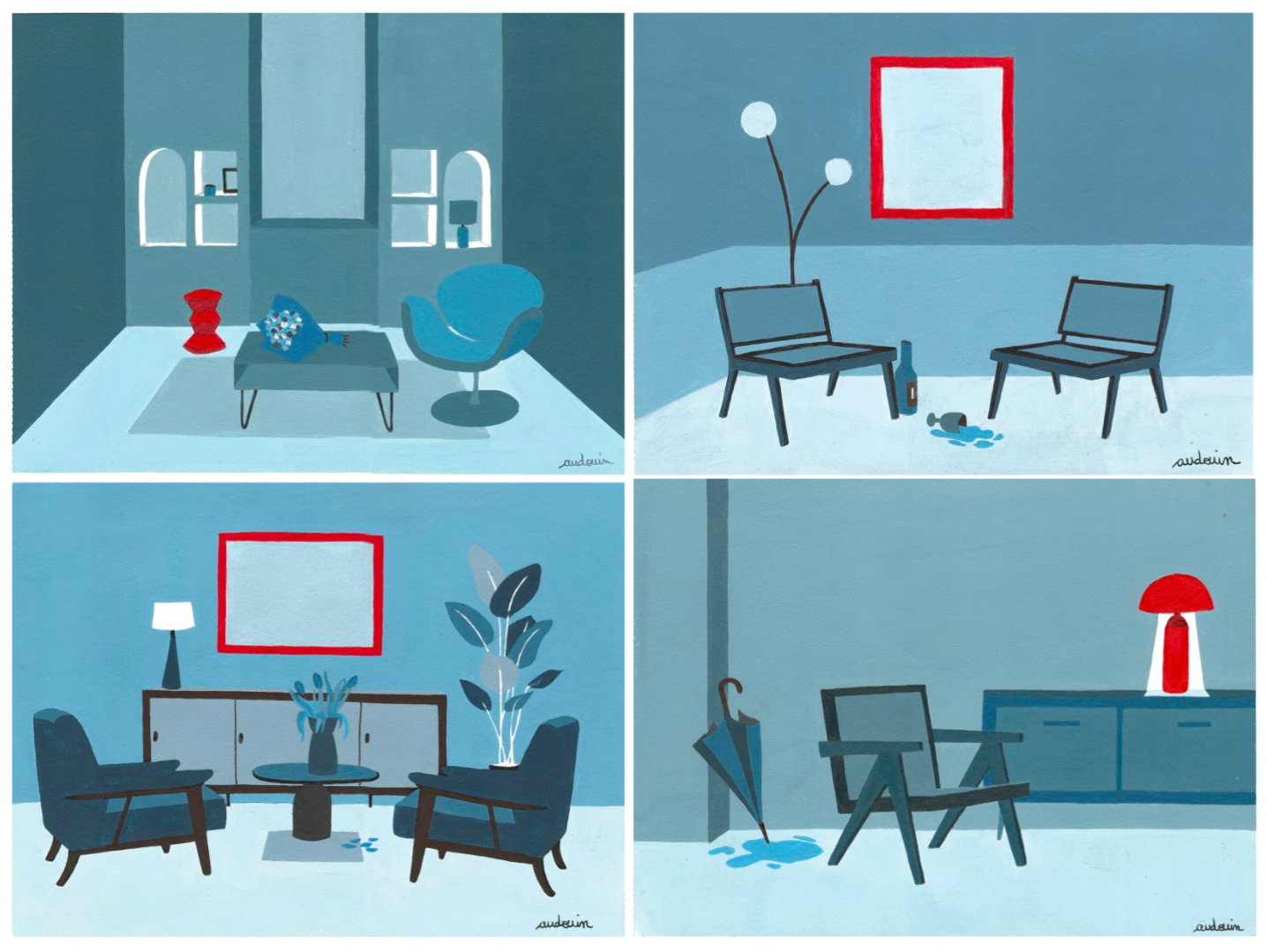 Symbole de calme et de sagesse, le bleu domine, infusant chaque composition d’une sérénité propice à la rêverie. Des touches de blanc diffusent une lumière délicate, ajoutant profondeur et équilibre. Dans ce calme apparent surgit toujours une unique pointe de rouge, intense et captivante. Elle attire irrésistiblement le regard et incarne la vie qui continue de palpiter même dans le silence. Signature de cet univers visuel, le contraste de couleurs incarne une intensité silencieuse, un équilibre subtil entre quiétude et vivacité.